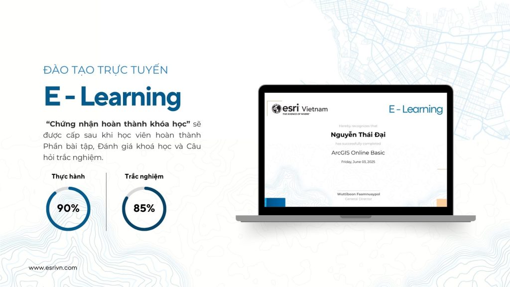 Nền tảngđào tạo trực tuyến E-Learning của Esri Việt Nam mang đến giải pháp học tập linh hoạt, hiện đại, đáp ứng tốt hơn nhu cầu ngày càng đa dạng của người dùng trong việc nâng cao kiến thức và kỹ năng sử dụng các phần mềm ArcGIS.