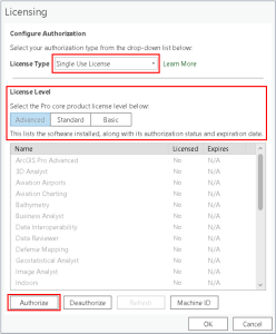 2. Mục “License Type” chọn “Single use License”, tab “License Level” chọn đúng loại License được cung cấp (Advanced – Standard – Basic), ấn “Authorize”